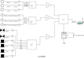 所有感應器之信號均於現場轉換為數位信號避免雜訊干擾或信號衰減發生,取樣之數位資料透過無線電傳訊系統直接送至現場電器室內之微型資料記錄器內作暫存。遠端可透過無線數據機傳送裝置傳送擷取記錄資料﹔以隨時掌握現場狀況。